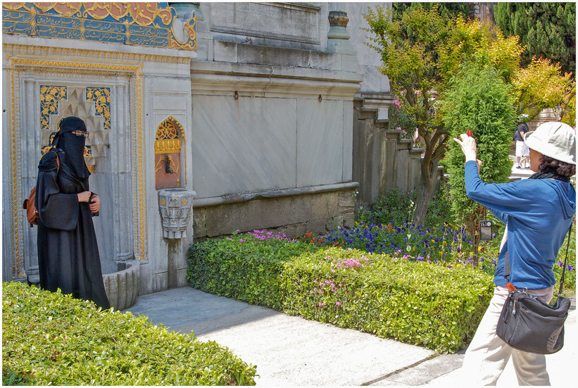 Das Foto ist vor ein paar Jahren bei einem Aufenthalt In Istanbul entstanden. Schauplatz ist der Sultanpalast Topkapı -(osmanisch طوپقپو سرايى Topkapı Sarayl). Hier treffen zwei Welten aufeinander, die modisch und für den Urlaub zweckmäßig gekleidete Touristin und die posierende Frau, total verschleiert, den strengen und uns mittelalterlich vorkommenden Regel eines Landes auf der arabischen Halbinsel entsprechend.